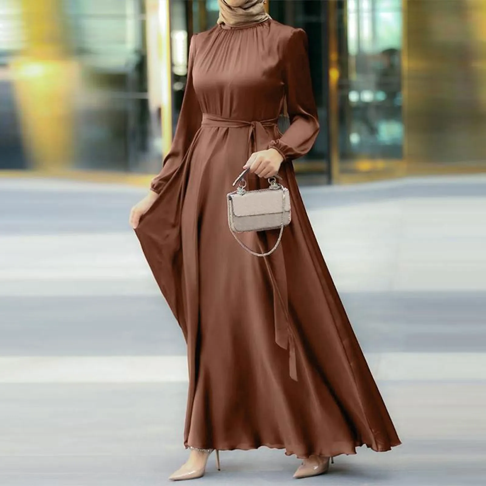 | 시크한 라마단 이드 튜닉 퍼프 슬리브 가디건, 무슬림 아바야스 기모노 무술망, 두바이 패션 무슬림 원피스, 벨트 아랍 | |