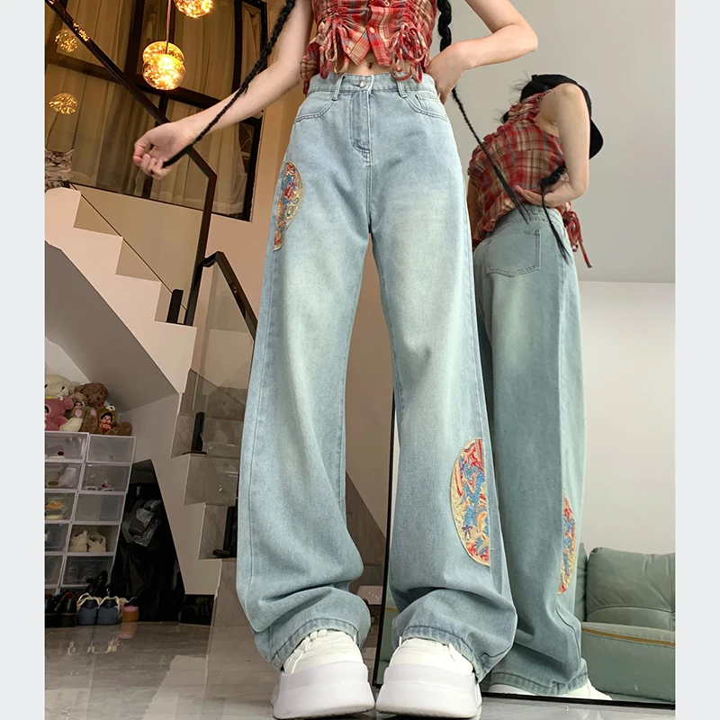 | 2024 여성용 하이웨이스트 루즈 홀 와이드 레그 팬츠, 레트로 워싱 청바지, 밝은 색상, 신상 | |